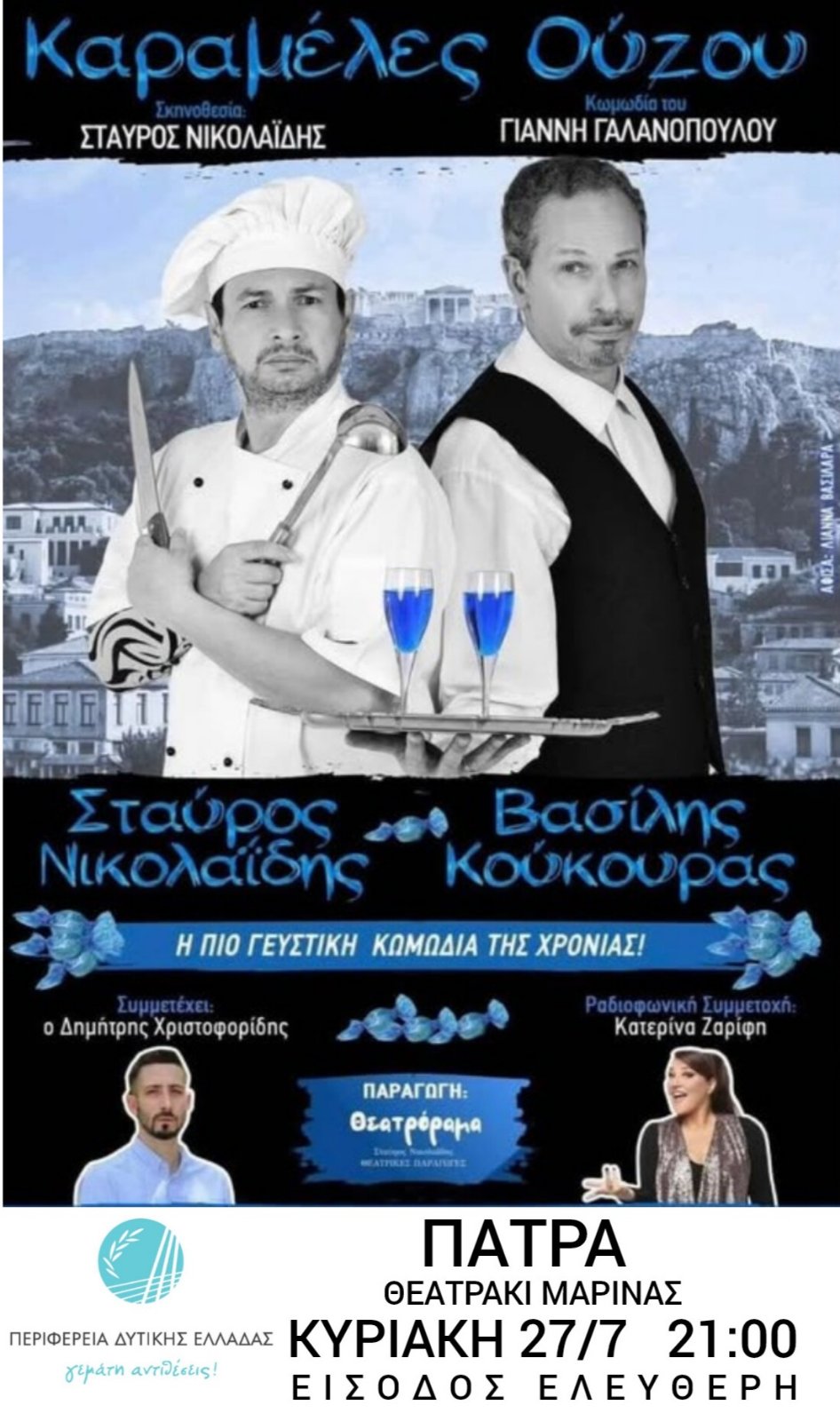 Η Περιφέρεια Δυτικής Ελλάδας διοργανώνει θεατρική παράσταση την Κυριακή στις 27 Ιουλίου 2025 στο ανοιχτό θεατράκι της Μαρίνας, στην Πάτρα, με τίτλο: «Καραμέλες Ούζου».