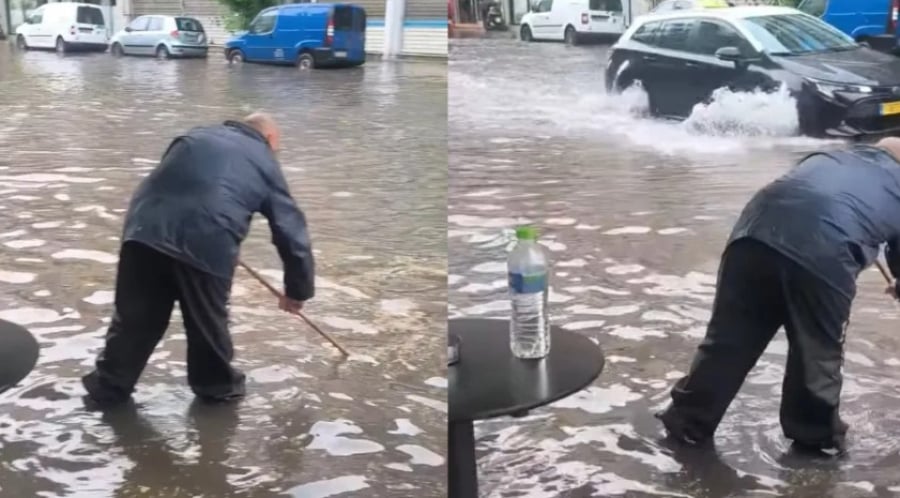 Καταστηματάρχες στην περιοχή των δικαστηρίων βγήκαν με σκούπες στο πεζοδρόμιο, για να απομακρύνουν τα νερά που απειλούσαν να μπουν στα μαγαζιά τους.