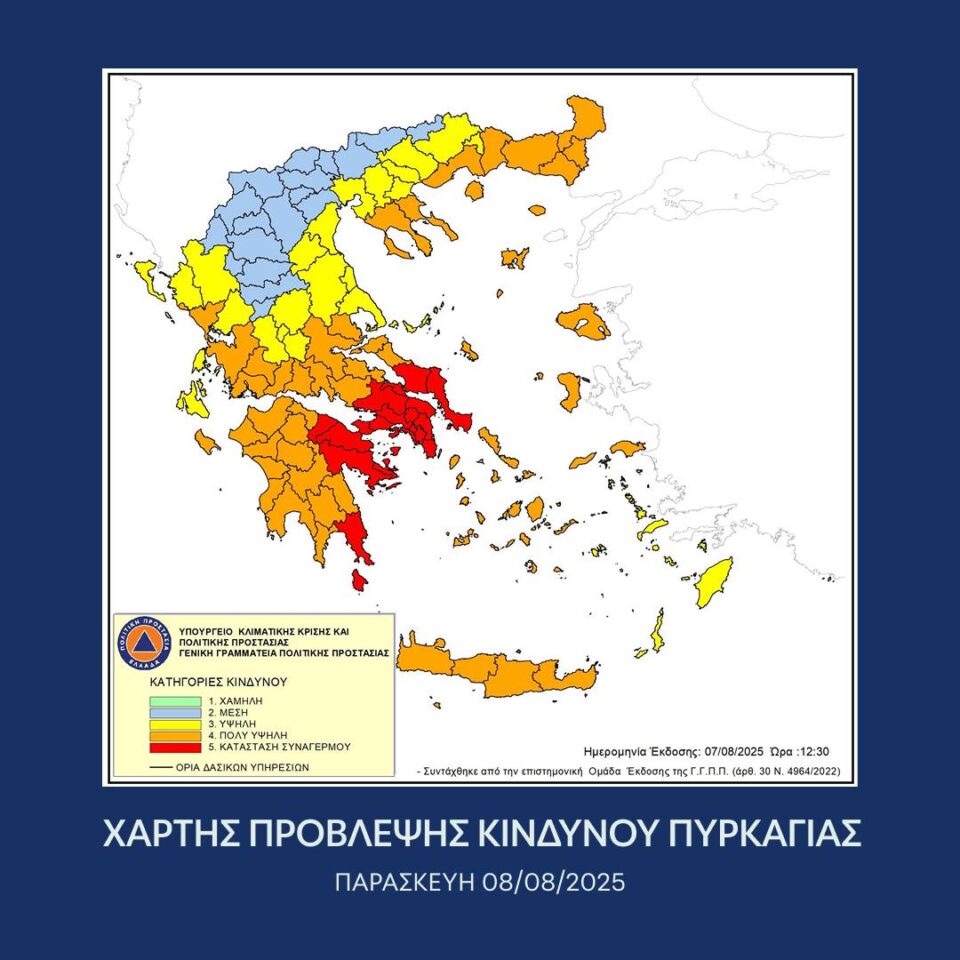 Πολύ υψηλή κατηγορία κινδύνου ( 4) προβλέπει ή Γενική Γραμματεία Πολιτικής Προστασίας σε περιοχές της Περιφέρειας Δυτική Ελλάδα, όπως φαίνεται στον επισυναπτόμενο ημερήσιο Χάρτη Πρόβλεψης Κινδύνου Πυρκαγιάς για την Παρασκευή 08/08/2025. Από την Πολιτική Προστασία εφισταται η προσοχή στους πολίτες να είναι προσεκτικοί και να αποφεύγουν ενέργειες που μπορούν να προκαλέσουν πυρκαγιά από αμέλεια