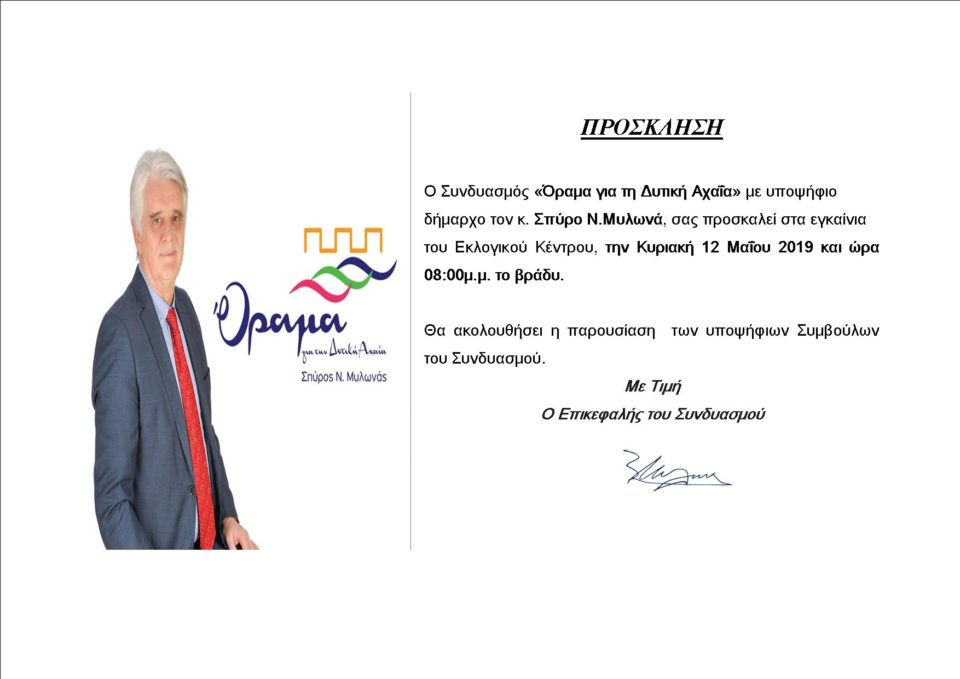 Κάλεσμα σε όλους του δημότες της Δυτικής Αχαΐας απευθύνει ο υποψήφιος Δήμαρχος και επικεφαλής της παράταξης “Όραμα για τη Δυτική Αχαΐα” Σπύρος Μυλωνάς για την Κυριακή 12 Μαΐου στις 8 το βράδυ στα εγκαίνια του εκλογικού κέντρου του συνδυασμού.