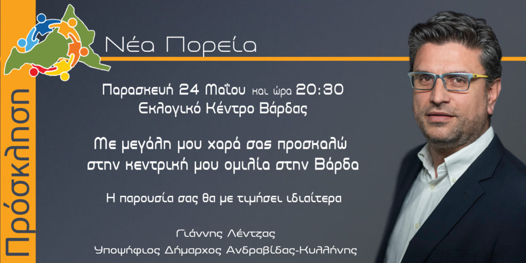 Ειδήσεις ΠολιτικήΑύριο η κεντρική ομιλία του Γιάννη Λέντζα στη Βάρδα Ηλείας by 4press23 Μαΐου 201924 Μαΐου 2019 Share0 Την Παρασκευή 24 Μαϊου θα πραγματοποιηθεί η κεντρική ομιλία του Υποψήφιου Δημάρχου Ανδραβίδας Κυλλήνης Γιάννη Λέντζα έξω απο το εκλογικό κέντρο Βάρδας στις 20:30.