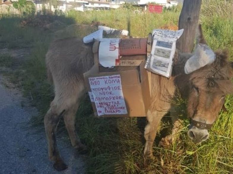 Ο γαϊδαράκος της φωτογραφίας, φορτωμένος με ένα σωρό χαρτιά με εκλογικά συνθήματα και με μια “κάλπη” στην πλάτη εγκαταλείφθηκε εδώ και πέντε μέρες στην τύχη του χωρίς νερο και φαγητό. Ευτυχώς τον εντόπισαν φιλόζωοι στην Πάτρα και πλέον αναζητείται “σπίτι” για να τον περιθάλψει.