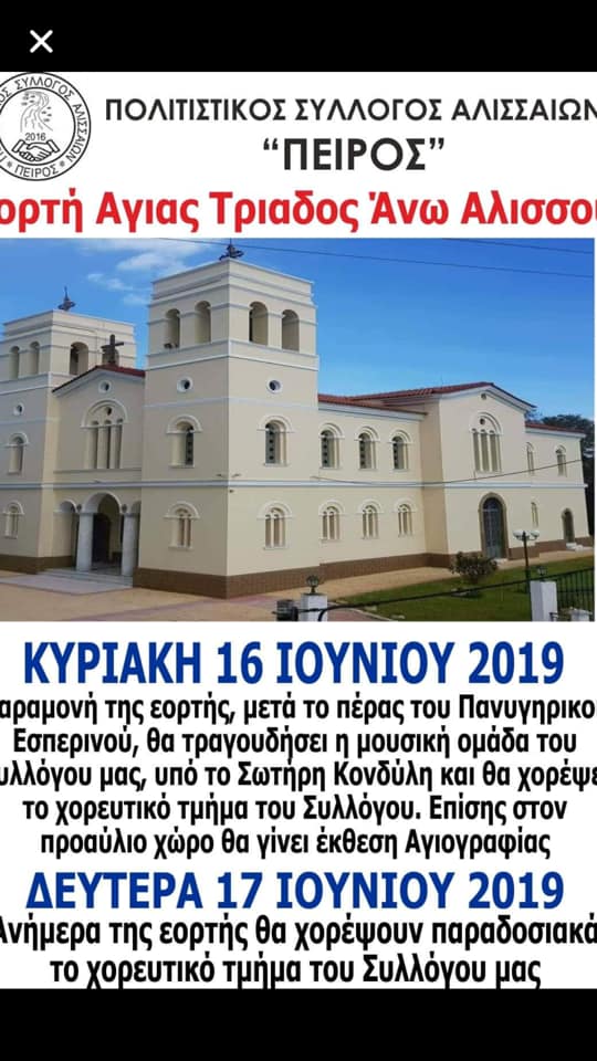 Πολιτισμός - LifestyleΠείρος: Ξεκίνησε το πολιτιστικό του πρόγραμμα – Εορτή της Αγίας Τριάδος Ανω Αλισσού by 4press15 Ιουνίου 201915 Ιουνίου 2019 Share0 Με λαμπρότητα θα πραγματοποιηθούν οι εκδηλώσεις της Αγίας Τριάδος”Πείρου”: