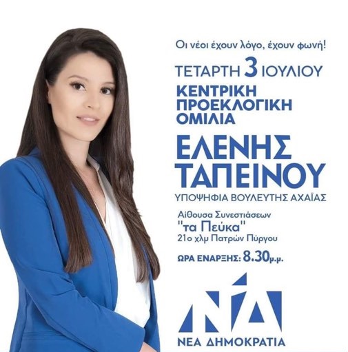 H υποψήφια Βουλευτής Αχαΐας της Ν.Δ. Ελένη Ταπεινού σήμεραΤετάρτη θα πραγματοποιήσει την κεντρική της προεκλογική ομιλία στην αίθουσα συνεδριάσεων “Τα Πεύκα”.