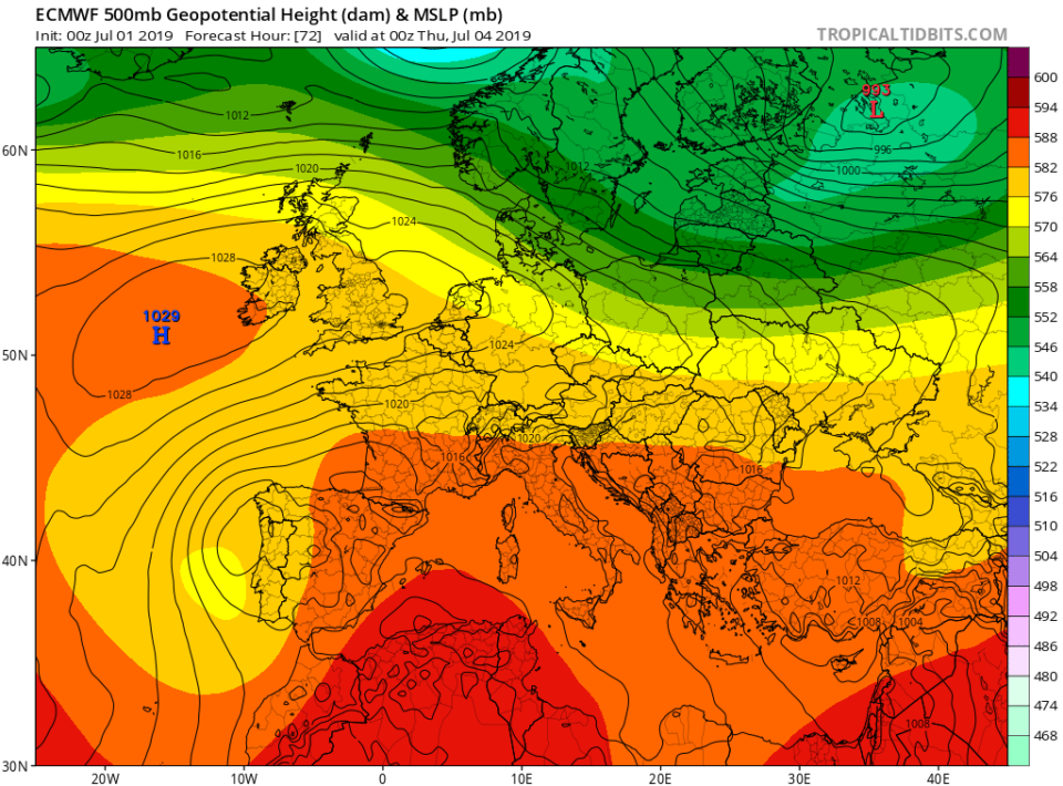 Το εκτενές αντικυκλωνικό πεδίο που κάλυπτε μεγάλο μέρος της κεντρικής και δυτικής Ευρώπης την προηγούμενη εβδομάδα αναμένεται να ‘’καταρρεύσει’’. Έτσι οι θερμές αέριες που το συνόδευαν αναμένεται εκφυλιζόμενες, βέβαια, να κινηθούν ανατολικότερα επηρεάζοντας και την περιοχή μας όπως και την ευρύτερη περιοχή της Βαλκανικής χερσονήσου. Η απόρροια αυτής της εξέλιξης θα είναι ένα έντονο κύμα ζέστης με θερμοκρασίες που θα αγγίξουν του 40-41oC στα ηπειρωτικά.το διάστημα 3-5 Ιουλίου. Μερική υποχώρηση των θερμών αερίων μαζών και μικρή κάμψη του υδραργύρου αναμένεται κατά την διάρκεια του Σ/Κ 6-7 Ιουλίου.