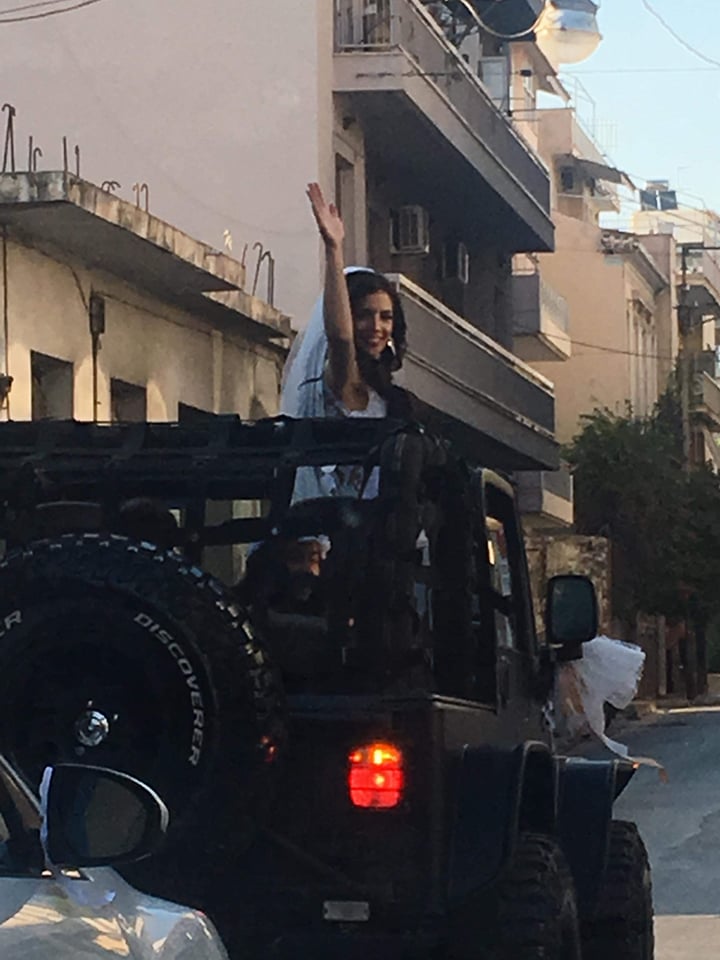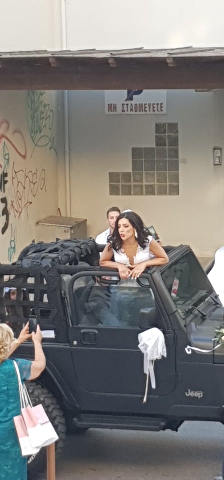 Οι λαμπερές τελετές έλαβαν χώρα στον Ιερό Ναό Αγίου Διονυσίου. Τα φλας πήραν φωτιά την στιγμή που η νύφη έφτασε στην εκκλησία μέσα σε ενα Τζιπ Wrangler, όρθια χαιρετώντας σε όλη τη διαδρομή οδηγούς και πεζούς ενώ στα σκαλιά της εκκλησίας την περίμεναν μπαμπάς και γιός.