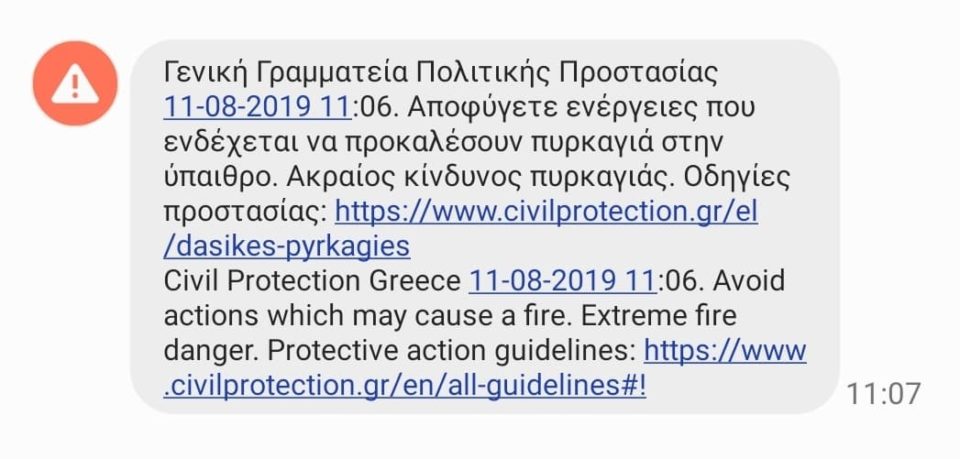 Χτες και σήμερα το μήνυμα στάλθηκε μαζικά σε όσους βρίσκονταν στις περιοχές ακραίου και υψηλού κινδύνου.