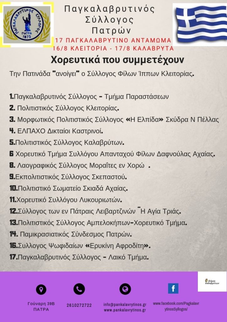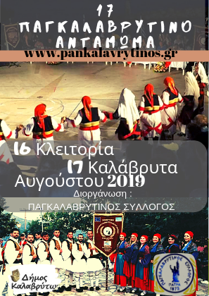 Όλα είναι έτοιμα για την έναρξη του 17oυ Παγκαλαβρυτινού Ανταμώματος 2019 που θα γίνει το διήμερο 16-17 Αυγούστου 2019 στις Κλειτορία και Καλάβρυτα αντίστοιχα. Στις εκδηλώσεις του διημέρου θα συμμετάσχουν τουλάχιστον 17 χορευτικά συγκροτήματα με πάνω από 300 χορευτές όπου με τις παραδοσιακές φορεσιές τους θα κατακλύσουν τους δρόμους της Κλειτορίας και των Καλαβρύτων,κατά το διήμερο.Σας προσκαλούμε όλους να έρθετε να παρακολουθήσετε τις εκδηλώσεις και να χορέψουμε όλοι μαζί στους ρυθμούς του 17ου Παγκαλαβρυτινού Ανταμώματος.