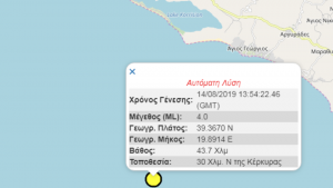 Σεισμός 4 Ρίχτερ σημειώθηκε ανοικτά της Κέρκυρας το μεσημέρι της Τετάρτης.