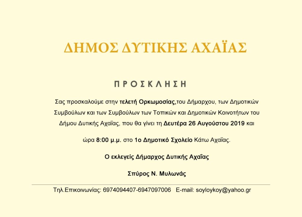 ΠολιτικήΣήμερα η τελετή ορκωμοσίας της νέας δημοτικής αρχής του Δήμου Δυτικής Αχαΐας by 4press26 Αυγούστου 201926 Αυγούστου 2019 Share0