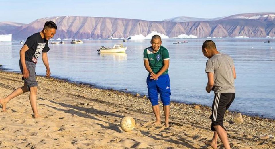 Με κοντομάνικα μπλουζάκια απαθανατίστηκαν έφηβοι να παίζουν στο Qaanaaq της βορειοδυτικής Γροιλανδίας, μιας από τις πιο βόρειες πόλεις του κόσμου, που βρίσκεται περίπου 1.100 χλμ βόρεια του Αρκτικού Κύκλου.