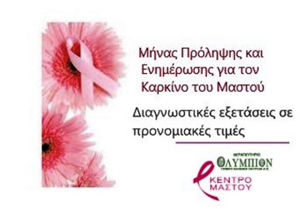 Βάλε στόχο τη Ζωή! Βάλε στόχο την πρόληψη! Το κέντρο μαστού του θεραπευτηρίου “Ολύμπιον”, με αφορμή τον μήνα ευαισθητοποίησης για τον Καρκίνο του Μαστού, παρέχει έκπτωση 20 % για διαγνωστικές προληπτικές εξετάσεις και ελέγχους . Η έκπτωση ισχύει για τις εξετάσεις που θα προγραμματιστούν έως τις 31 Οκτωβρίου.