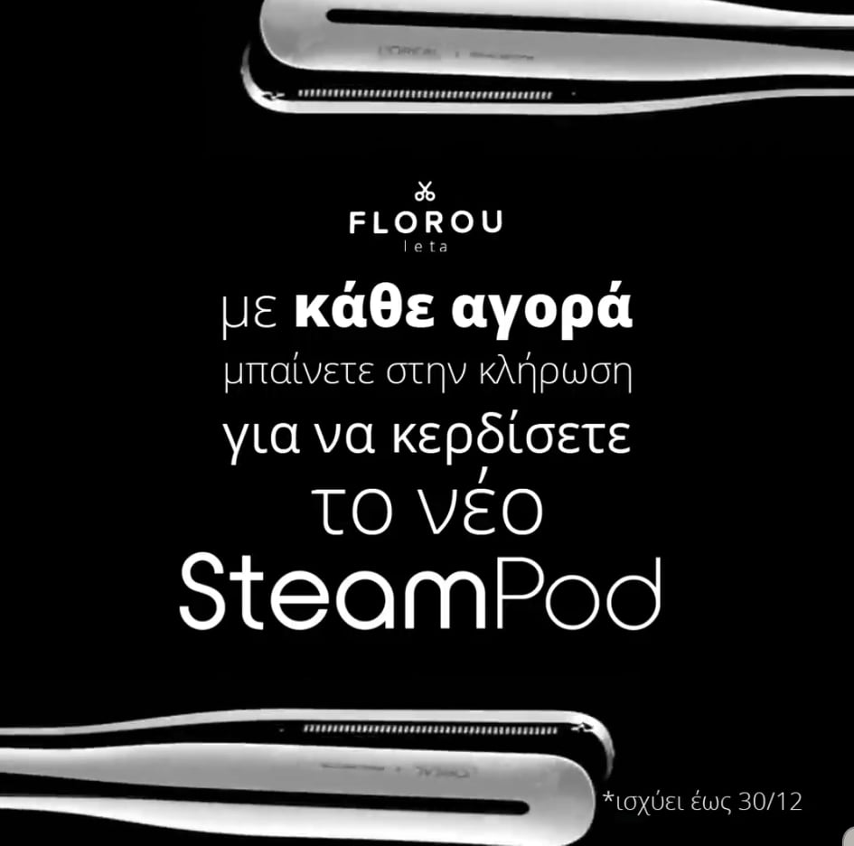 Γι’ αυτο και το hair salon “Florou Excel” επειδή σέβεται και αγαπά την κάθε γυναίκα και τα υγιή μαλλιά σας το κάνει δικό σας. Με κάθε αγορά απο το κατάστημα Florou Excel (Καραϊσκάκη & Μιαούλη 80, Πάτρα) μέχρι τις 30/12 μπαίνετε στην κλήρωση για να κερδίσετε το μοναδικό LOREAL STEAMPOD (αξίας 240 ευρώ)!