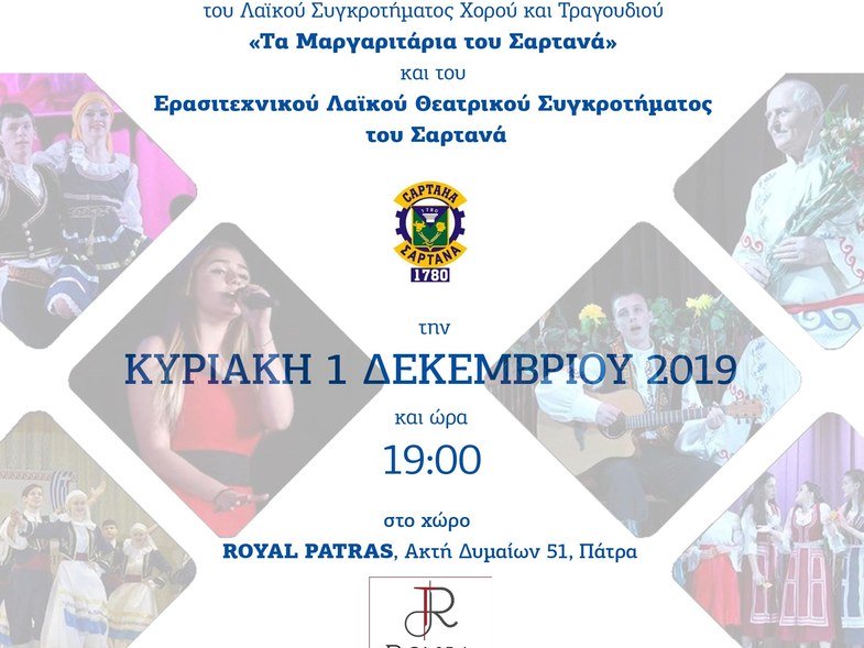 Ο Σύλλογος Ελληνοουκρανικής φιλίας ‘’Ο Φάρος‘’ διοργανώνει παράσταση των μελών του χορευτικού τμήματος του λαϊκού συγκροτήματος χορού & τραγουδιού «Τα μαργαριτάρια του Σαρτανά» και του Ερασιτεχνικού Λαϊκού θεατρικού συγκροτήματος του Σαρτανά, την Κυριακή 1η Δεκεμβρίου 2019 στις 19.00 το απόγευμα στο Royal – παλαιό Πτωχοκομείο στην Ακτή Δυμαίων.