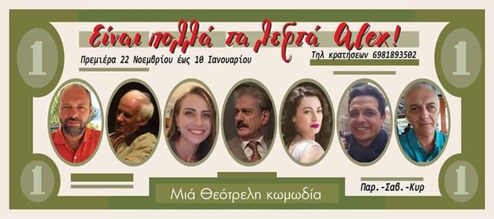 Μια θεότρελη κωμωδία με πολλά….λεφτά και πολύ γέλιο!!!Μια παραγωγή της ΣΠΥΡΟΠΟΥΛΟΣ Α.Ε.που ανεβαίνει στο ΜΗΧΑΝΟΥΡΓΕΙΟ , Ευμήλου 2 πίσω από τον Α.Ανδρέα σε σκηνοθεσία του Μίλτου Σπυρόπουλου .Παίζουν : Σάκης Κλήρης (Άλεξ),Βασιλική Ξούλου(Λίλα),Κων/νοςΤομαράς (Νικ),Ευτυχία Μπιλέλη (Μπέτυ),Μίλτος Σπυρόπουλος(Ντετέκτιβ),Αντώνης Μπαρμπετάκης(Σλάτερ),Κώστας Σπυρόπουλος(Ταξιτζής).