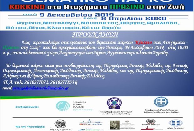 Η Περιφέρεια Δυτικής Ελλάδας συνδιοργανώνει με τη Γενική Περιφερειακή Αστυνομική Διεύθυνση Δυτικής Ελλάδας και την Περιφερειακή Διεύθυνση Πρωτοβάθμιας και Δευτεροβάθμιας Εκπαίδευσης Δυτικής Ελλάδας το Θεματικό Πάρκο με αντικείμενο την Κυκλοφοριακή Αγωγή και τίτλο: «Κόκκινο στα Ατυχήματα – Πράσινο στη Ζωή».