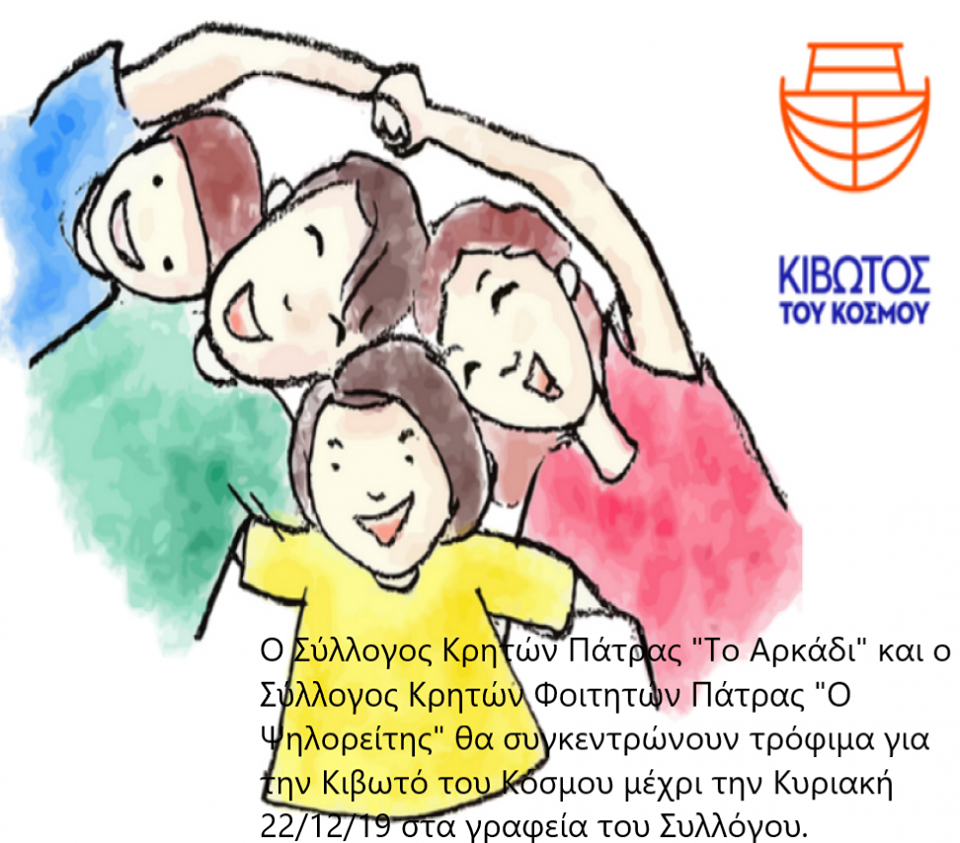 Ο Σύλλογος Κρητών Πάτρας “Το Αρκάδι” και ο Σύλλογος Κρητών φοιτητών Πάτρας “Ο Ψηλορείτης”συγκεντρώνουν τρόφιμα για την κιβωτό του κόσμου μέχρι την Κυριακή 22.12.2019 στα γραφεία του Συλλόγου Αγίας Σοφίας & Δοϊράνης 11.