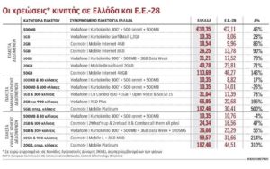 Στο μεταξύ, προχθές (19 Δεκεμβρίου) η Ευρωπαϊκή Επιτροπή παρουσίασε τη νέα έκθεση για τις χρεώσεις κινητής στην Ενωμένη Ευρώπη των «28». Η έκθεση καταρτίστηκε από τη γερμανική εταιρεία Empirica για λογαριασμό της Κομισιόν και παρουσιάζει την Ελλάδα ως τη δεύτερη πιο ακριβή χώρα στην Ε.Ε.-28, πίσω από τη Σλοβακία. Οι χρεώσεις στην Ελλάδα, σύμφωνα με τα στοιχεία της έρευνας, ανάλογα με το εξεταζόμενο πακέτο, εμφανίζονται έως και πέντε φορές πιο υψηλές απ’ ό,τι είναι ο μέσος όρος της Ευρώπης.
