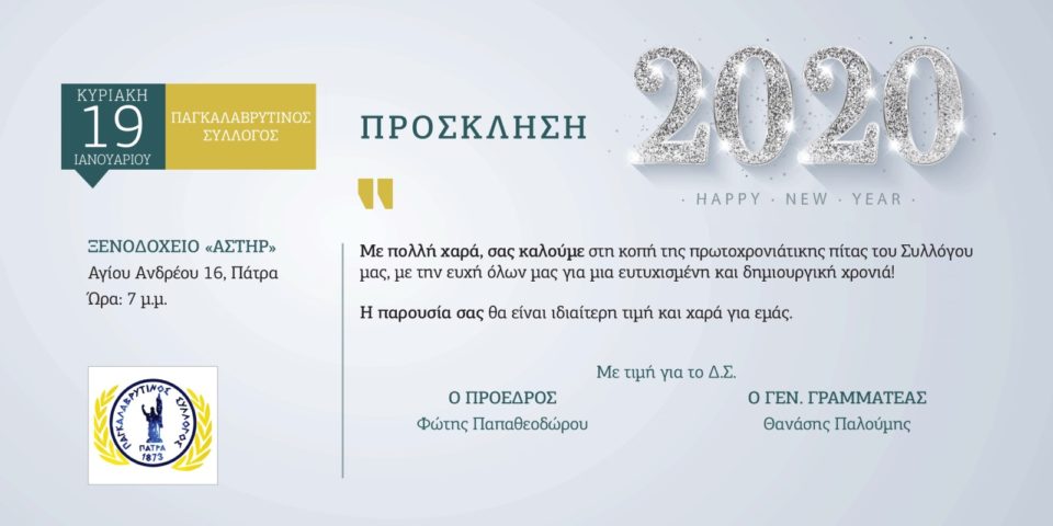 Σας προσκαλούμε στην κοπή της Πρωτοχρονιάτικης πίτας του Παγκαλαβρυτινού Συλλόγου που θα γίνει την ΚΥΡΙΑΚΗ 19/01/2020 και ώρα 07,00 μμ ,στο ξενοδοχείο Αστήρ στην Πάτρα.