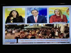 Η βασίλισσα του Πατρινού Καρναβαλιού, στο κεντρικό δελτίο ειδήσεων του Super B… Kαι όπως είδατε, δεν είναι μόνον όμορφη, αλλά και ιδιαίτερα καλλιεργημένη… Στη φωτό διακρίνονται, μαζί με τη Βασίλισσα του 2020, οι… οικοδεσπότες αυτής της τηλεοπτικής συνάντησης, Γιώργος Πλης, Δημήτρης Χωρίτος και Μαρία Ανδριέλου…
