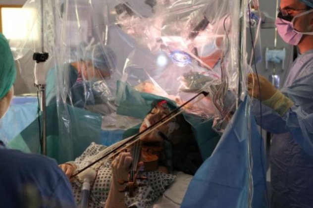 Αυτή η επέμβαση, όμως, ήταν διαφορετική από τις άλλες αφού η ασθενής έπαιζε βιολί, ενώ, παράλληλα, οι χειρουργοί αφαιρούσαν τον όγκο.