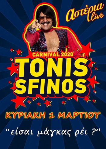 Πολιτισμός - LifestyleΟ Tonis Sfinos στα Αστέρια by 4press25 Φεβρουαρίου 2020 Share0 Ο Tonis Sfinos επιστρέφει στην Πάτρα… για να κάψει τον Βασιλιά Καρνάβαλο !!! Κυριακή 1 Μαρτίου Αστέρια Live Έναρξη 21.30
