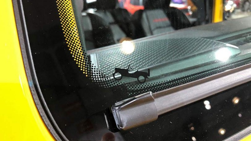 Στο πίσω παρμπρίζ του Jeep Wrangler υπάρχει μία γραφιστική απεικόνιση του αυτοκινήτου σε φάση αναρρίχησης, που υπογραμμίζει τις εκτός δρόμου ικανότητες του συγκεκριμένου μοντέλου. Ταυτόχρονα «υποχρεώνει» τους κατόχους των Wrangler να αντικαθιστούν, αν χρειαστεί, το σπασμένο ή χαλασμένο πίσω παρμπρίζ των αυτοκινήτων τους με ένα γνήσιο εργοστασιακό.