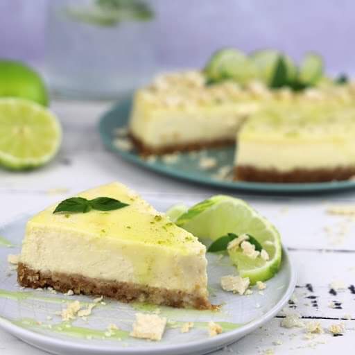 Ξεφορμάρετε το τσιζκέικ μέσα σε έναν δίσκο σερβιρίσματος. Πριν το σερβίρετε, στολίστε το με φρέσκα φυλλαράκια δυόσμου και φετούλες από λάιμ.