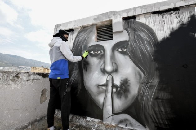 Εντυπωσιακό είναι το γκράφιτι που δημιούργησε ένας 16χρονος στην ταράτσα του σπιτιού του με θέμα την ενδοοικογενειακή βία. Σε αυτό απεικονίζεται μία γυναίκα, με εμφανή τα σημάδια της κακοποίησης στο πρόσωπό της και ένα παιδί.