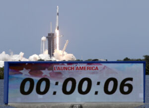 Μέσα σε εκκωφαντικό θόρυβο που έφτασε χιλιόμετρα μακριά στις ακτές της Φλόριντα, ένας πύραυλος Falcon 9 της SpaceX του Ελον Μασκ απογειώθηκε στις 15.22 τοπική ώρα (22.22 ώρα Ελλάδος) και τα πρώτα λεπτά της πτήσης εκτυλίχθηκαν χωρίς προβλήματα. Η NASA μετέδωσε ζωντανά την εκτόξευση, με εκατ. ανθρώπους από όλο τον κόσμο να παρακολουθούν την ιστορική στιγμή.