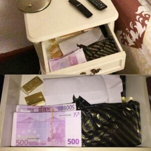 Παράλληλα, στις φωτογραφίες που κυκλόφορησαν στα media της χώρας, διακρίνονται ράβδοι χρυσού και μετρητά στο ανοιχτό συρτάρι του κομοδίνου.
