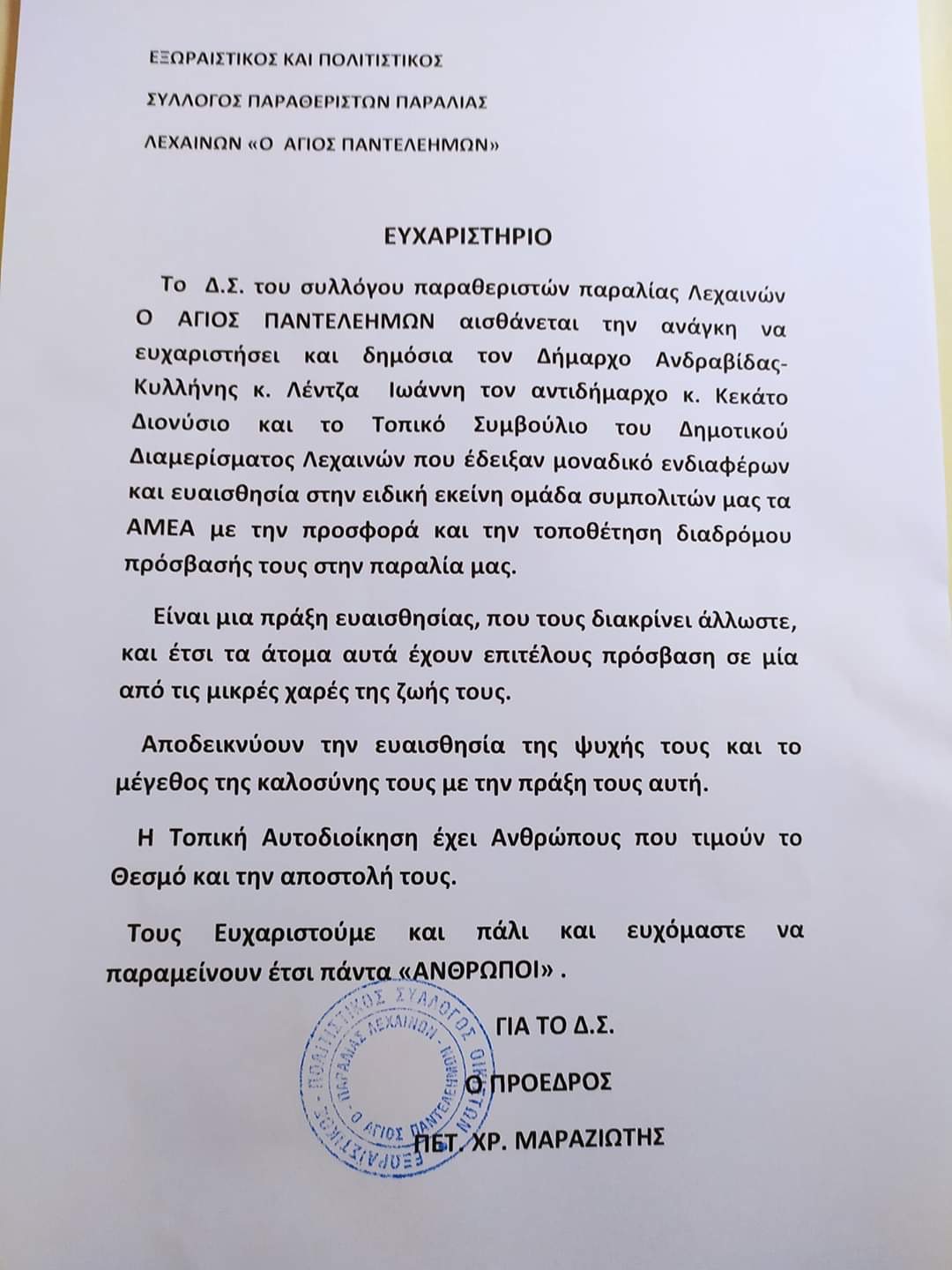 πρωί ο Σύλλογος παραθεριστών παραλίας Λεχαινών « Ο Άγιος Παντελεημων», για το
