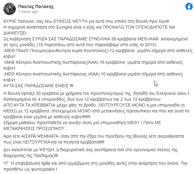 Χωρίς να προσκομίσει κανένα στοιχείο, ο Π. Πολάκης υποστήριξε πως ό,τι έχει γράψει για τις ΜΕΘ ισχύει στο ακέραιο, επικαλούμενος τις συνομιλίες του «με γιατρούς». Ζήτησε μάλιστα από τον πρωθυπουργό Κυριάκο Μητσοτάκη να διώξει τον διοικητή του νοσοκομείου, επειδή λέει ψέματα.