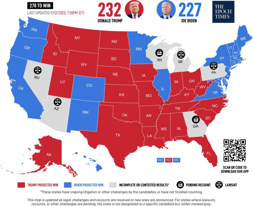 Mε βάση το γεγονός ότι αμφισβητούνται τα εκλογικά αποτελέσματα σε έξι Πολιτείες των ΗΠΑ και συγκεκριμένα στο Μίσιγκαν, στο Γουισκόνσιν, στη Νεβάδα, στην Αριζόνα, στην Τζόρτζια και στην Πενσυλβάνια, ο πρόεδρος Τραμπ σύμφωνα με το theepochtimes, λαμβάνει 232 εκλέκτορες έναντι 227 του Τζο Μπάιντεν.