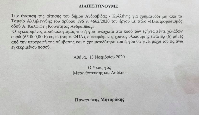 Την έγκριση της αίτησης του Δήμου Ανδραβίδας-Κυλλήνης για χρηματοδότηση από το Ταμείο Αλληλεγγύης του άρθρου 196 ν. 4662/2020 του έργου «Ηλεκτροφωτισμός της οδού Α. Καλφιώτη στη Δημοτική Κοινότητα Ανδραβίδας», ενέκρινε ο Υπουργός Μετανάστευσης και Ασύλου κ. Μηταράκης Π.