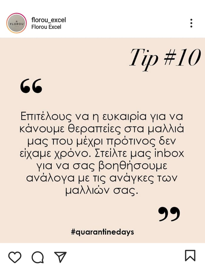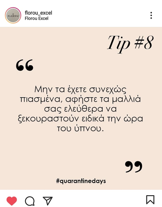 Επιτέλους να η ευκαιρία για να κάνουμε θεραπείες στα μαλλιά μας που μέχρι πρότινος δεν είχαμε χρόνο. Η γνωστή hairstylist Λέτα Φλώρου μας ενημερώνει μέσα απο τους λογαριασμούς της στο facebook (Florou Excel) και στο Instagram Florou_Excel δίνοντας μας πολύτιμες συμβουλές για την υγεία των μαλλιών μας εν μέσω καραντίνας.