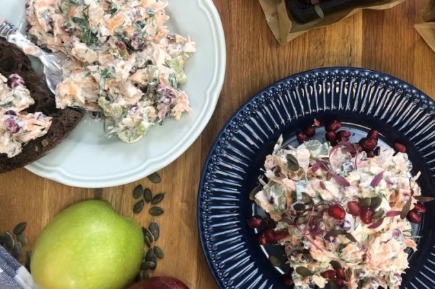 Σερβίρουμε πάνω σε φέτες μήλου, ή σε κομμάτια σέλερι. Επίσης, μπορούμε να τυλίξουμε την κοτοσαλάτα σε φύλλα λάχανου.