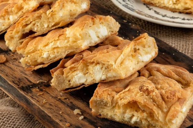 - Απλώνουμε τη γέμιση σε όλη την επιφάνεια του φύλλου. Ανοίγουμε το δεύτερο κομμάτι της ζύμης και καλύπτουμε τη γέμιση. Φροντίζουμε να κάνουμε πτυχές σε όλη την επιφάνειά του.