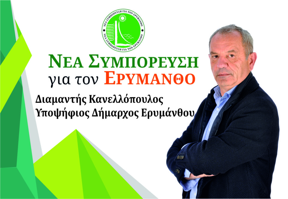Η «Νέα Συμπόρευση για τον Ερύμανθο» με επικεφαλής και υποψήφιο Δήμαρχο Ερυμάνθου τον Διαμαντή Κανελλόπουλο στελεχώνει σταδιακά το ψηφοδέλτιο με νέα πρόσωπα που τους ενώνει το όραμα για έναν Δήμο ισχυρό, διεκδικητικό και ανεξάρτητο. Ένα ψηφοδέλτιο αντιπροσωπευτικό, με αξιόλογους ανθρώπους μα πάνω απ’ όλα ενεργούς πολίτες που είναι έτοιμοι να καταθέσουν την εμπειρία, την «φρεσκάδα» και τις προτάσεις τους προς όφελος των συμπολιτών τους.