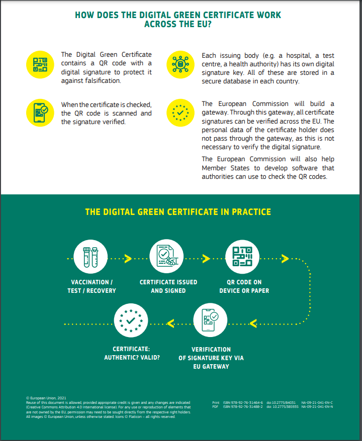 Το Ψηφιακό Πράσινο Πιστοποιητικό θα είναι απόδειξη ότι ένα άτομο έχει εμβολιαστεί κατά του COVID-19, έλαβε αρνητικό αποτέλεσμα σε τεστ ή ανάρρωσε από την COVID-19. Θα είναι δωρεάν, σε ψηφιακή ή έντυπη μορφή. Θα περιλαμβάνει έναν κωδικό QR για τη διασφάλιση της ασφάλειας και της αυθεντικότητας του πιστοποιητικού.