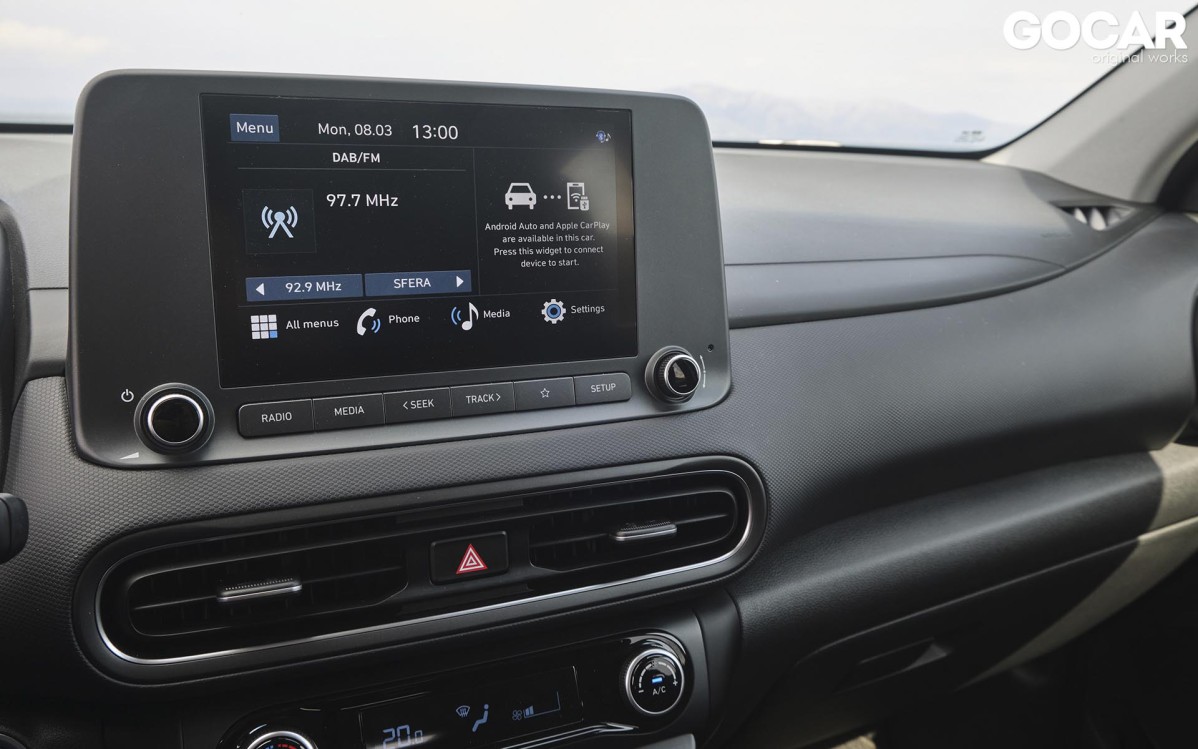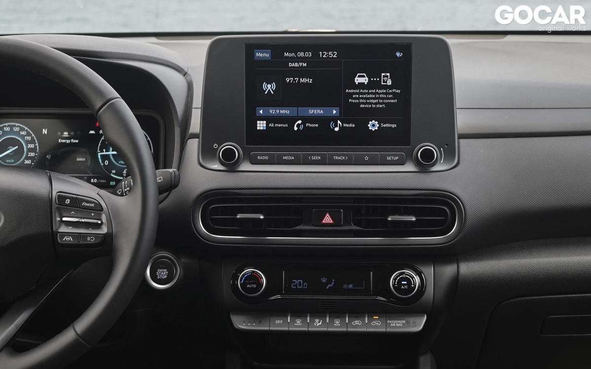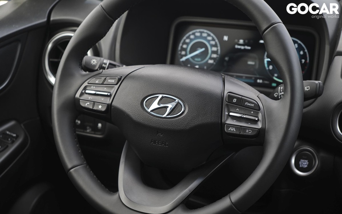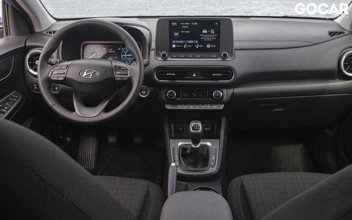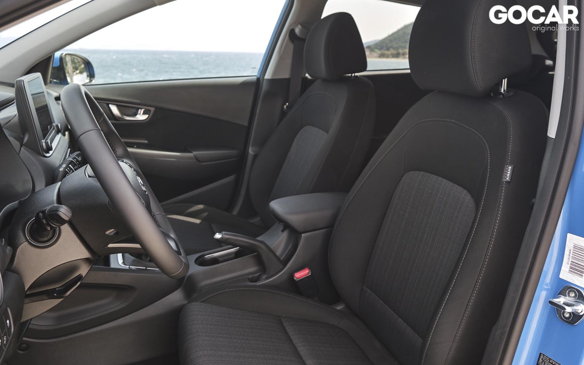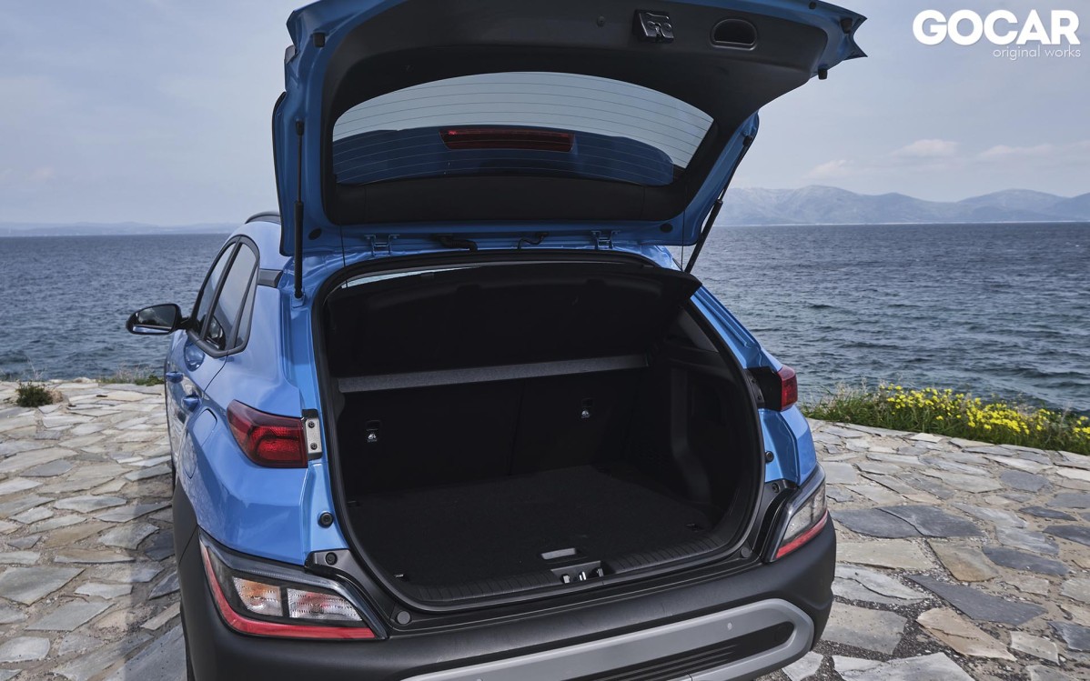 Ο αέρας ανανέωσης που πνέει στη Hyundai είναι εμφανής και τη στιγμή που θα ανοίξεις την πόρτα του εσωτερικού. Το Kona εισέρχεται και αυτό με τη σειρά του στην digital εποχή, με τον ψηφιακό πίνακα οργάνων που γνωρίσαμε στα i20 και Tucson να δεσπόζει μπροστά από τον οδηγό. Την ίδια ώρα, στη κεντρική κονσόλα ξεχωρίζει η νέα οθόνη αφής, που στην περίπτωση μας έχει διάσταση 8 ιντσών και φιλοξενεί τη νεότερη γενιά του συστήματος πολυμέσων της Hyundai. H ποιότητα κατασκευής είναι πολύ καλή, ενώ αξίζει να σημειώσουμε πως στο Kona του 2021 έχει γίνει χρήση νέων πιο ανθεκτικών υλικών. Οι χώροι του παραμένουν αμετάβλητοι, κάτι που σημαίνει ότι μπορούν άνετα να φιλοξενηθούν τέσσερις ενήλικες στο εσωτερικό του. Μάλιστα, ελαφρώς αυξημένος είναι ο χώρος αποσκευών, ο οποίος και αγγίζει τα 347 lt, αντί των 361 lt της προηγούμενης γενιάς. Όσον αφορά την ασφάλεια των επιβατών, φροντίζει η ομπρέλα ασφαλείας Hyundai Smartsense με περισσότερα από δέκα συστήματα υποβοήθησης του οδηγού, που μάλιστα περιλαμβάνονται στον εξοπλισμό του από τη βασική έκδοση.