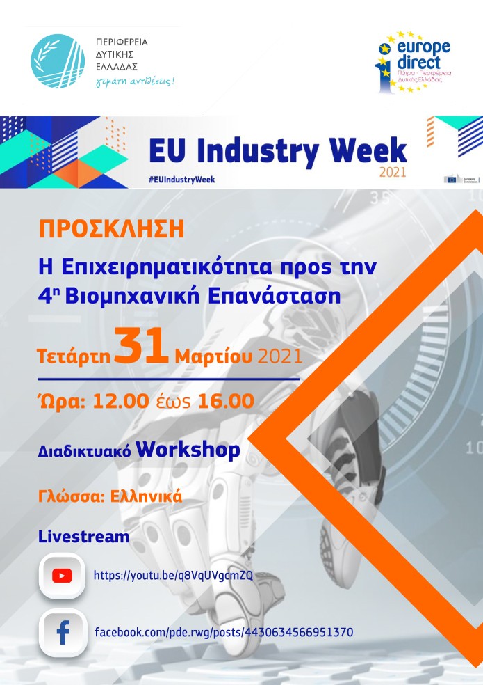 Στο πλαίσιο αυτό η Περιφέρεια Δυτικής Ελλάδας διοργανώνει με την αρωγή του Europe Direct Patra διαδικτυακό workshop με τίτλο: «Η Επιχειρηματικότητα προς την 4η Βιομηχανική Επανάσταση»,την Τετάρτη 31 Μαρτίου2021 και ώρα 12.00 – 16.00. Το διαδικτυακό workshop θα αποτελείται από τις εξής συνεδρίες: