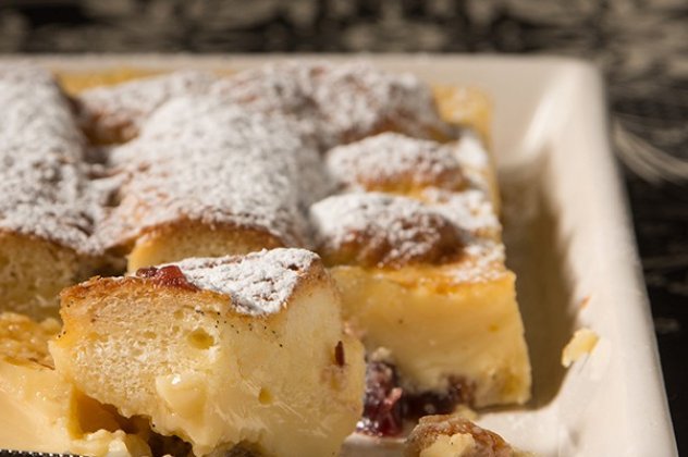 Βουτυρώνουμε και αλευρώνουμε ένα ταψί διαμέτρου 24 εκ. Βάζουμε μέσα τη μισή ζύμη μπριός και την πιέζουμε με τα δάχτυλά μας να απλώσει μέσα στο ταψί όπως μια ζύμη πίτσας. Από πάνω ρίχνουμε το μείγμα του γάλακτος, τα κεράσια ή τις σταφίδες και τα ξερά φρούτα. Τοποθετούμε το σκεύος μέσα σε ένα μεγαλύτερο βαθύ ταψί στο οποίο ρίχνουμε νερό, μέχρι τη μέση. Τοποθετούμε σε προθερμασμένο φούρνο, στους 180° C, και ψήνουμε για 50 λεπτά περίπου ελέγχοντας συχνά το χρώμα.