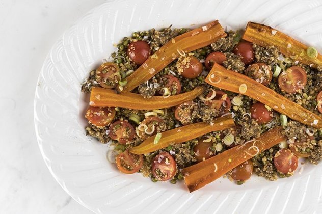 - Ανακατεύουμε σε ένα μεγάλο μπολ τα καρότα, τη ροβίτσα, την κινόα, τα ντοματίνια, το κρεμμυδάκι, το σκόρδο, και τα αφήνουμε στην άκρη μέχρι να τα χρειαστούμε.