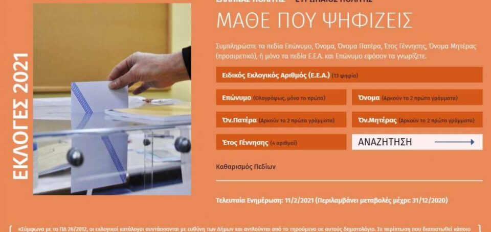 Αναστάτωση προκάλεσε στα social media η επιγραφή «Εκλογές 2021» στη σελίδα «Μάθε που ψηφίζεις» της ιστοσελίδας του υπουργείου Εσωτερικών. Ο τίτλος κατέβηκε άμεσα μετά τα σχετικά σχόλια, ενώ το υπουργείο Εσωτερικών, εξέδωσε ανακοίνωση στην οποία αναφέρει: