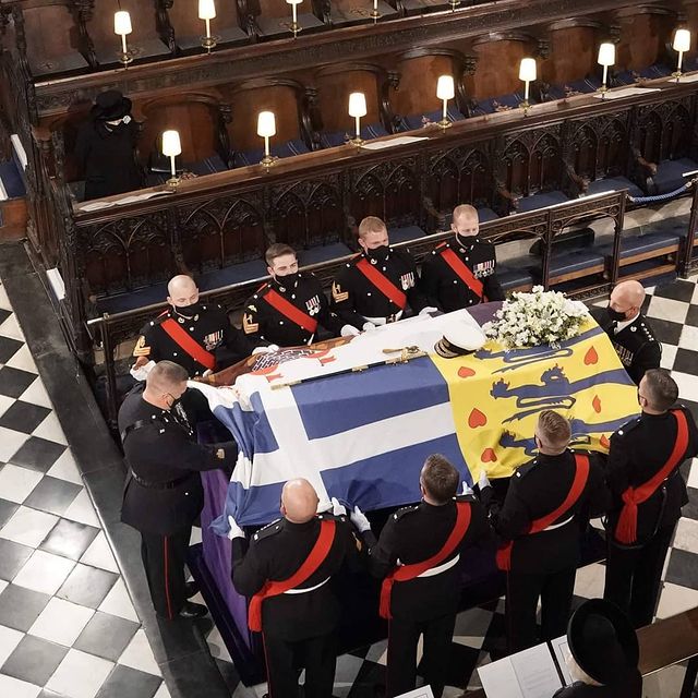 Το φέρετρο ήταν σκεπασμένο με την προσωπική σημαία του δούκα του Εδιμβούργου, αποτελούμενη από την ελληνική σημαία, τις μαύρες και άσπρες ρίγες της οικογένειας Μάουντμπάτεν, το κάστρο του Εδιμβούργου και τον θυρεό του Οίκου της Δανίας. Ηταν στολισμένο με το μπουκέτο από λευκά τριαντάφυλλα, κρίνα και γιασεμί που τοποθέτησε η βασίλισσα.