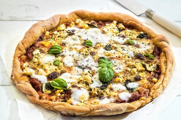 Βάζουμε τη ζύμη πάνω στο ξύλο κοπής. Αλείφουμε με τη σάλτσα ντομάτας αφήνοντας κενό 2-3 εκ. ώστε να φουσκώσει τριγύρω και να κρατήσει μέσα τα υλικά. Προσθέτουμε το σαλάμι, τα κολοκυθάκια, τη μοτσαρέλα και τον βασιλικό. Τοποθετούμε μικρά κομμάτια φέτας ανάμεσα στα κενά, περιχύνουμε με το ελαιόλαδο και πασπαλίζουμε με αλάτι και πιπέρι. Ψήνουμε 15′ περίπου να ροδίσει γύρω γύρω και να γίνει τραγανή.