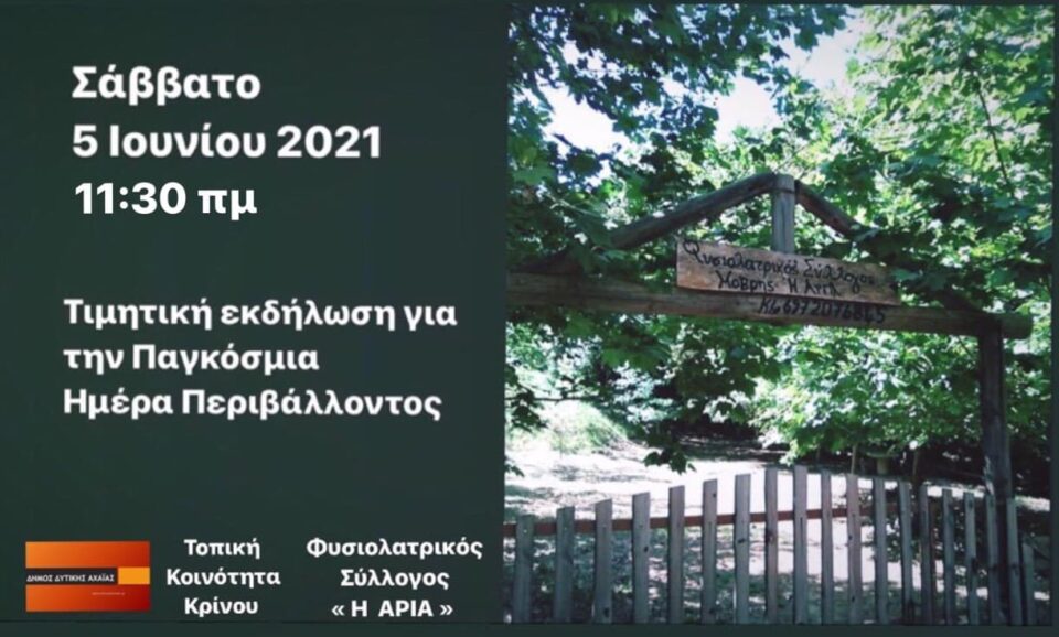 Με ποικίλους τρόπους τιμά ο Δήμος Δυτικής Αχαΐας την Παγκόσμια Ημέρα Περιβάλλοντος κι ανάμεσά τους ξεχωρίζει η ειδική εκδήλωση που θα γίνει το Σάββατο (5/6) στην τοπική κοινότητα Κρίνου στις 11.30 το πρωί. Εκεί και τότε ο Δήμος Δυτικής Αχαΐας από κοινού με την τοπική κοινότητα και το Φυσιολατρικό Σύλλογο «Η ΑΡΙΑ» συνδιοργανώνουν εκδήλωση περιβαλλοντικής ευαισθητοποίησης στο πάρκο του Φυσιολατρικού Συλλόγου με κεντρικό ομιλητή τον Ανδρέα Παναγιωτόπουλο, πρώην δήμαρχο Δυτικής Αχαΐα