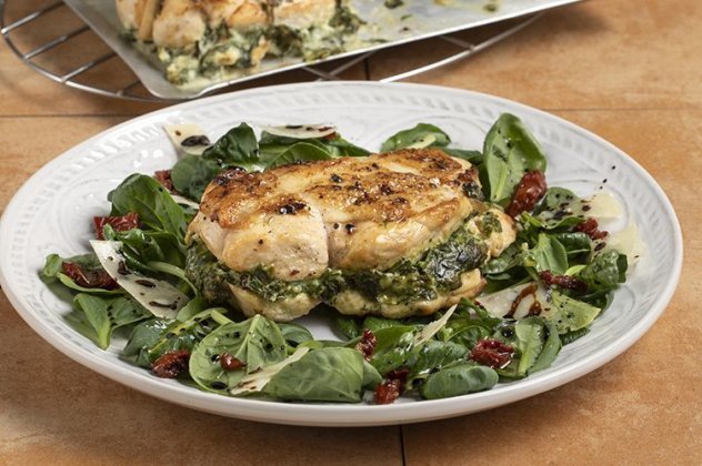 Σερβίρουμε τα στήθη του κοτόπουλου μαζί με σαλάτα.