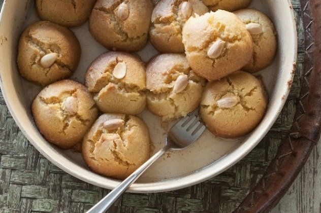 Αφήνουμε τη ζύμη να ξεκουραστεί στο ψυγείο για 3 – 4 ώρες, μέχρι να σφίξει και να μπορούμε να πλάσουμε μπισκότα.Προθερμαίνουμε τον φούρνο στους 170°C. Παίρνουμε δόσεις από τη ζύμη και πλάθουμε στρογγυλά μπαλάκια σε μέγεθος καρυδιού (διαμέτρου δηλαδή γύρω στα 4 εκ.). Τα πιέζουμε ελαφρώς με την παλάμη να γίνουν λίγο πλακέ και βάζουμε στο κέντρο του καθενός από ένα ολόκληρο αμύγδαλο. Τα αραδιάζουμε σε ένα μεγάλο και βαθύ ταψί ή σε πυρίμαχο σκεύος, αφήνοντας αρκετή απόσταση μεταξύ τους, γιατί θα απλώσουν στο ψήσιμο. Φουρνίζουμε και ψήνουμε για 30 – 40 λεπτά έως ότου πάρουν χρυσαφί χρώμα. Λίγο πριν τα βγάλουμε, ετοιμάζουμε το σιρόπι.